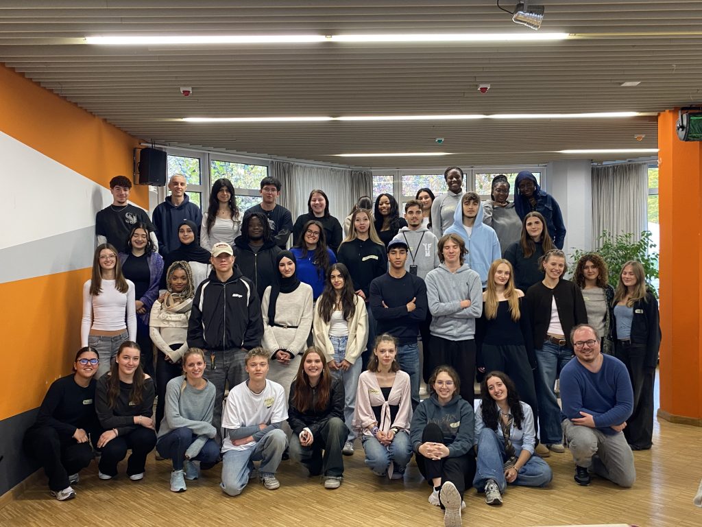 von links nach rechts, 1. Schülersprecherin*in Nneka Ezeoffia (13C), Stellvertretung: Mireya Schories (13C), 2. Schülersprecher*in Stellvertretung: Meyra Sönmez (12E), Danielle Onakoya (12E), 3. Schülersprecher*in Dogan Bereket (A-Block, 11E) (Stellvertretung: Djamila Ouedraogo, B-Block; 11I)
